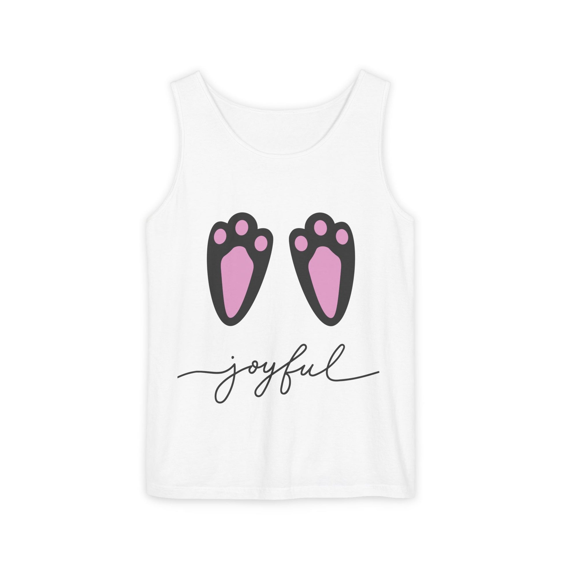 Celebrate your love for pets with this charming unisex garment-dyed tank top! Featuring cute paw prints and the word 'joyful,' this tank exudes a fun, relaxed vibe perfect for casual outings or cozy days at home. Made from soft, ring-spun cotton, it promises comfort and breathability, making it ideal for summer adventures or lounging around. This tank top is perfect for animal lovers, pet owners, or anyone wanting to express their playful spirit. It's a great gift for occasions like birthdays, pet adoption anniversaries, or just to brighten someone's day!